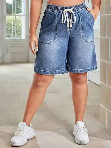 Casual Denim Shorts, Women's Casual Stretch Denim Mid-Thigh Shorts with Elastic Drawstring Waist, Light Blue Washed Denim, Comfortable Spring/Summer Jean Shorts.